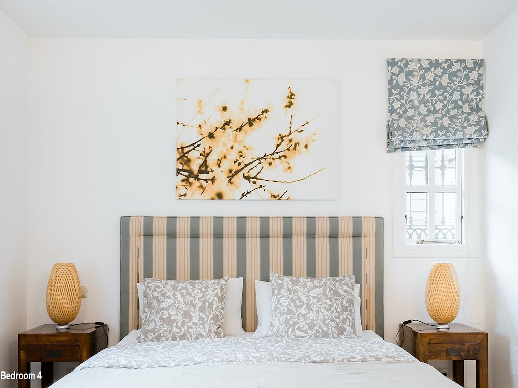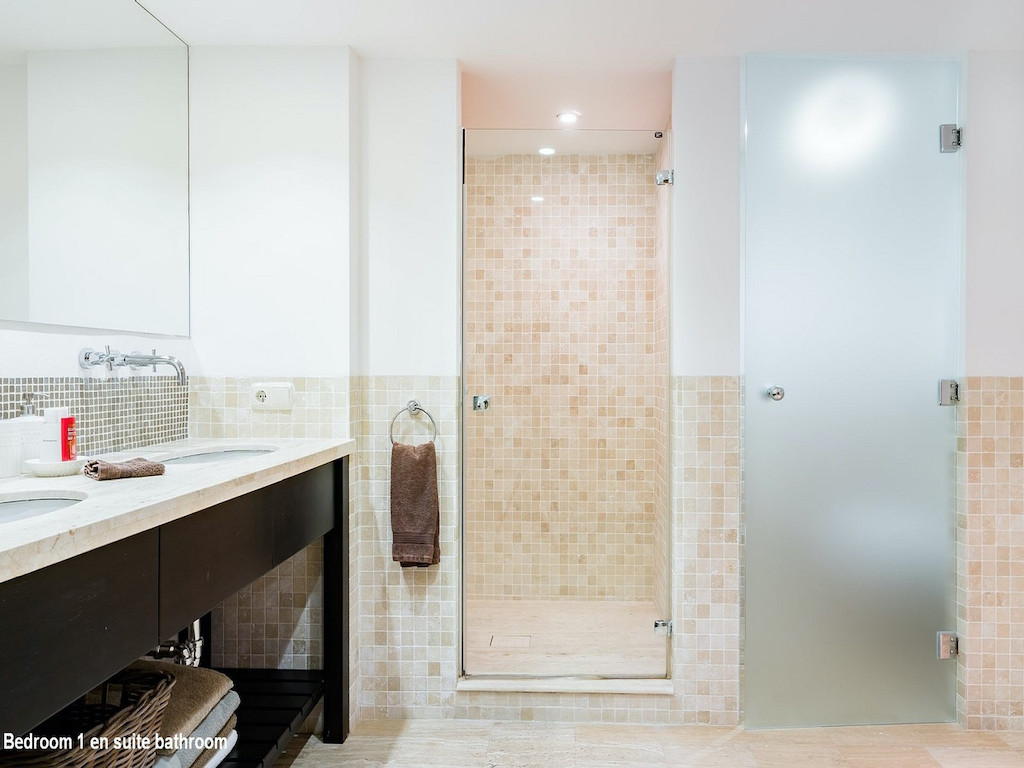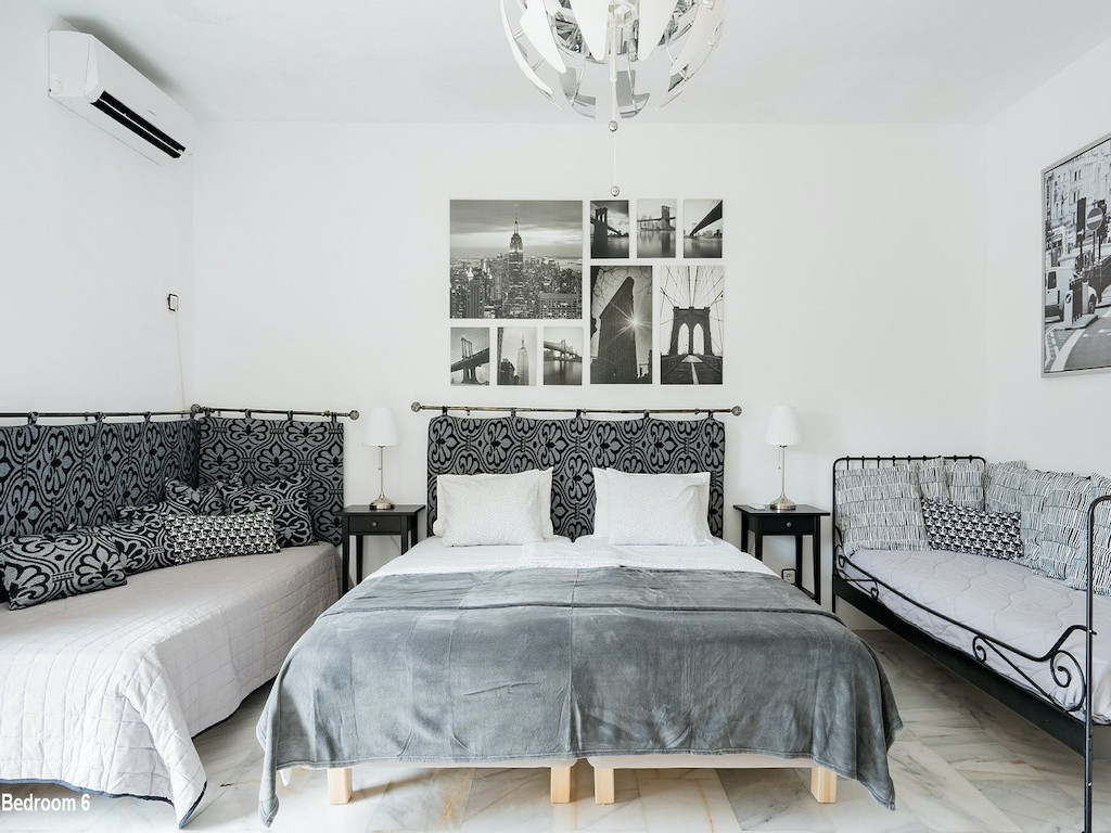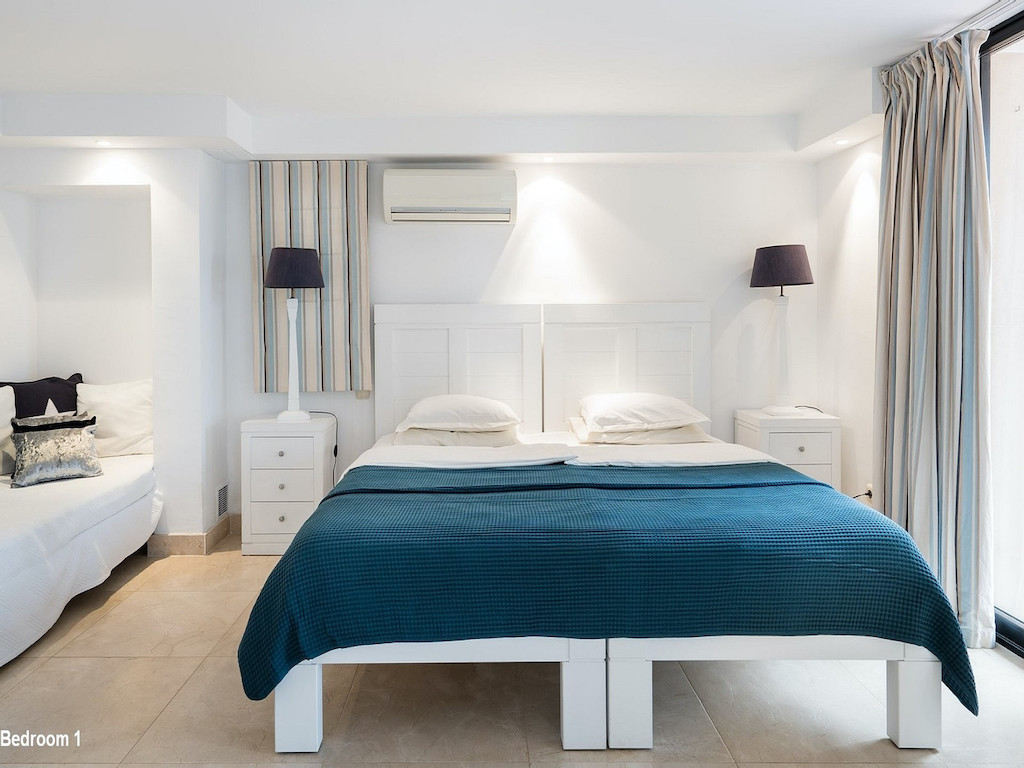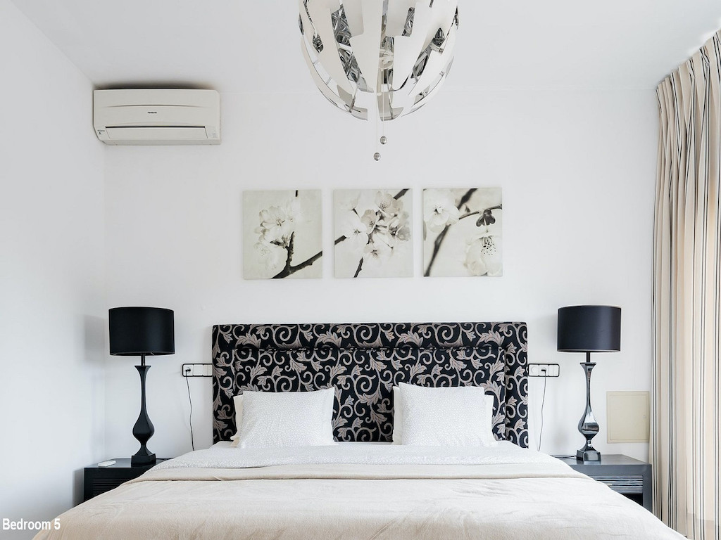 Description of the bedrooms: Bedroom 1: Two or three single beds (or double bed). Ensuite bathroom with sauna. Bedroom 2: Double bed (or two single beds). Ensuite bath. Bedroom 3: Double bed (or two single beds). Ensuite bath. Bedroom 4: Double bed (or two single beds). Ensuite bath. Bedroom 5: Large double bed (220×220). Bedroom 6: Double bed (or two single beds) +1 single bed Bedrooms 1-4 are located in the western part of the house (by the pool) and bedrooms 5 and 6 are located in the eastern part of the house.