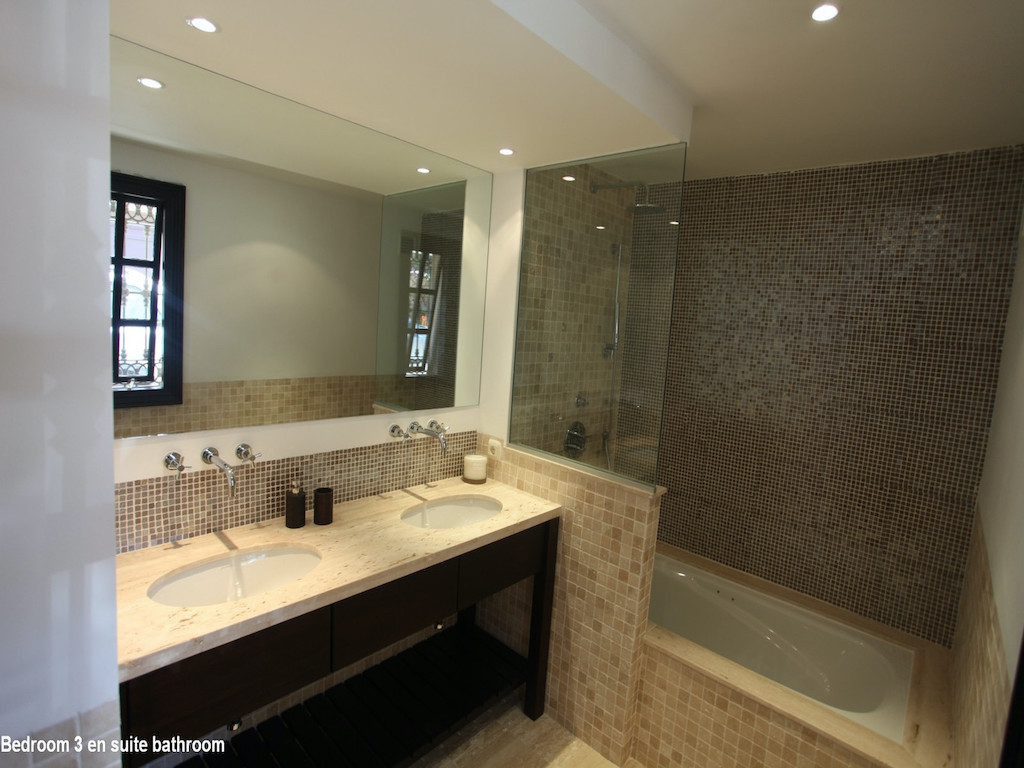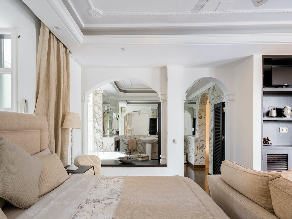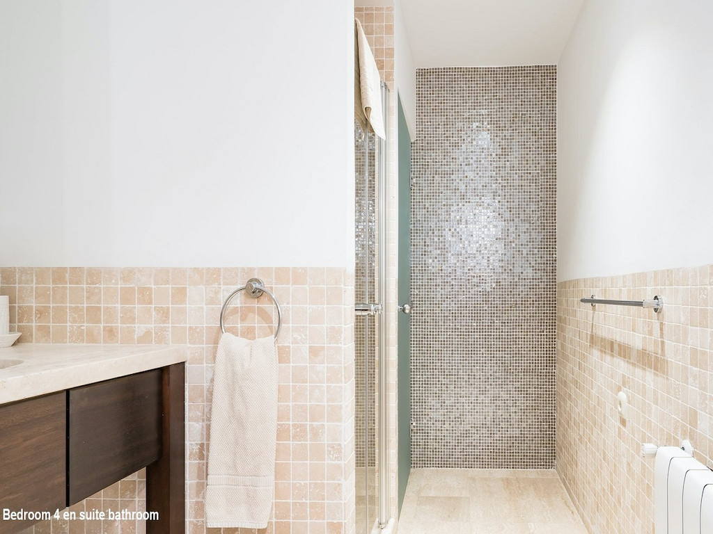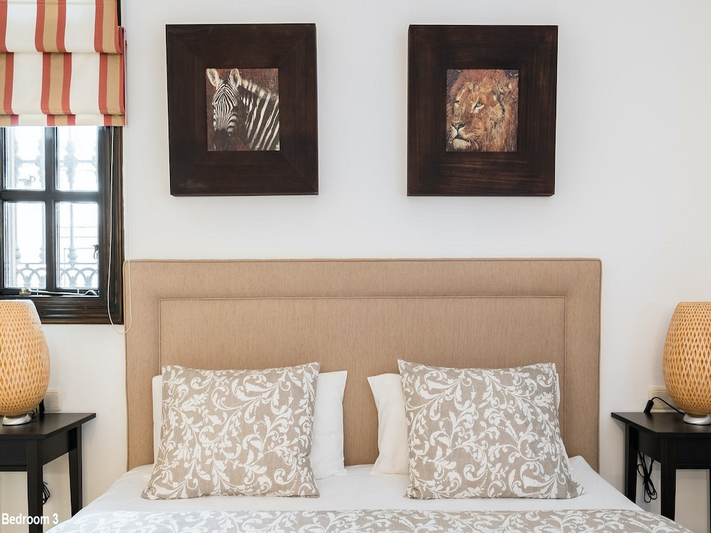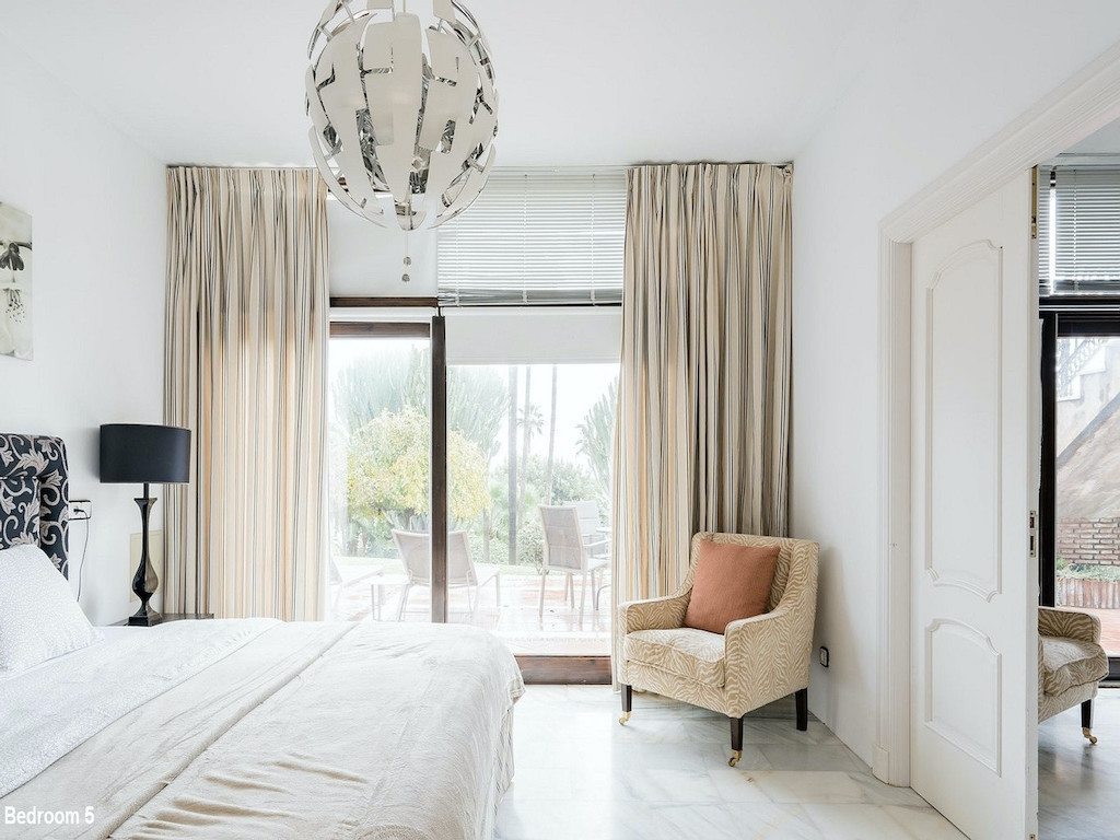 Description of the bedrooms: Bedroom 1: Two or three single beds (or double bed). Ensuite bathroom with sauna. Bedroom 2: Double bed (or two single beds). Ensuite bath. Bedroom 3: Double bed (or two single beds). Ensuite bath. Bedroom 4: Double bed (or two single beds). Ensuite bath. Bedroom 5: Large double bed (220×220). Bedroom 6: Double bed (or two single beds) +1 single bed Bedrooms 1-4 are located in the western part of the house (by the pool) and bedrooms 5 and 6 are located in the eastern part of the house.