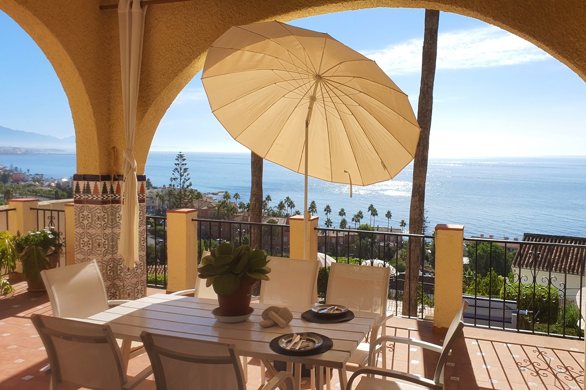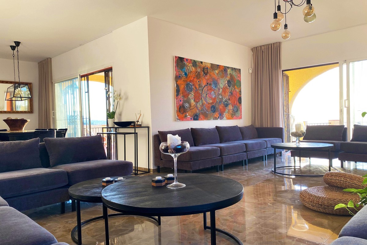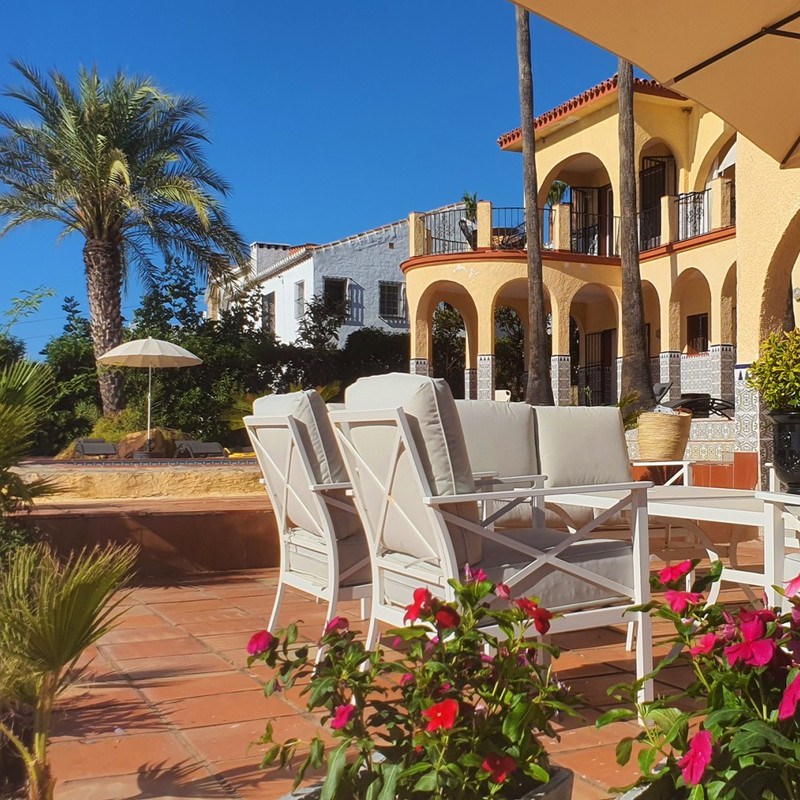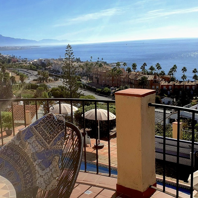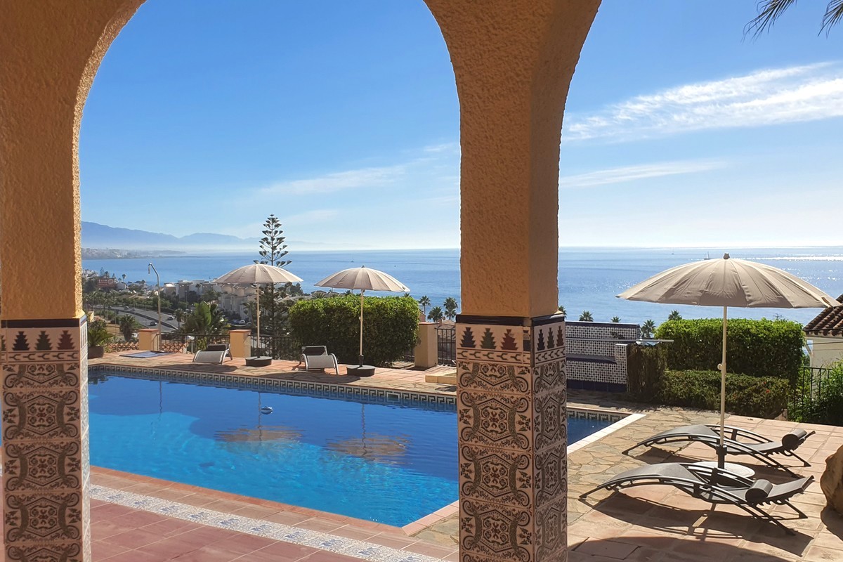 A cosy 7-bedrooms rental villa on The New Golden Mile in Estepona with spectacular panoramic views. This lovely villa is located in a nice quiet residential area of Estepona only 500 meters from the beach and close to all amenities, bars, restaurants, banks, and public transport. 1,6 km to the known beach restaurant Bahía Beach, 5,7 km to the magnificent port of Puerto de la Duquesa, 6,5 km to the charming city centre of Estepona, 27 km to the world-famous Marbella and only 50 minutes’ drive to Malaga´s International Airport trough the highway AP-7.