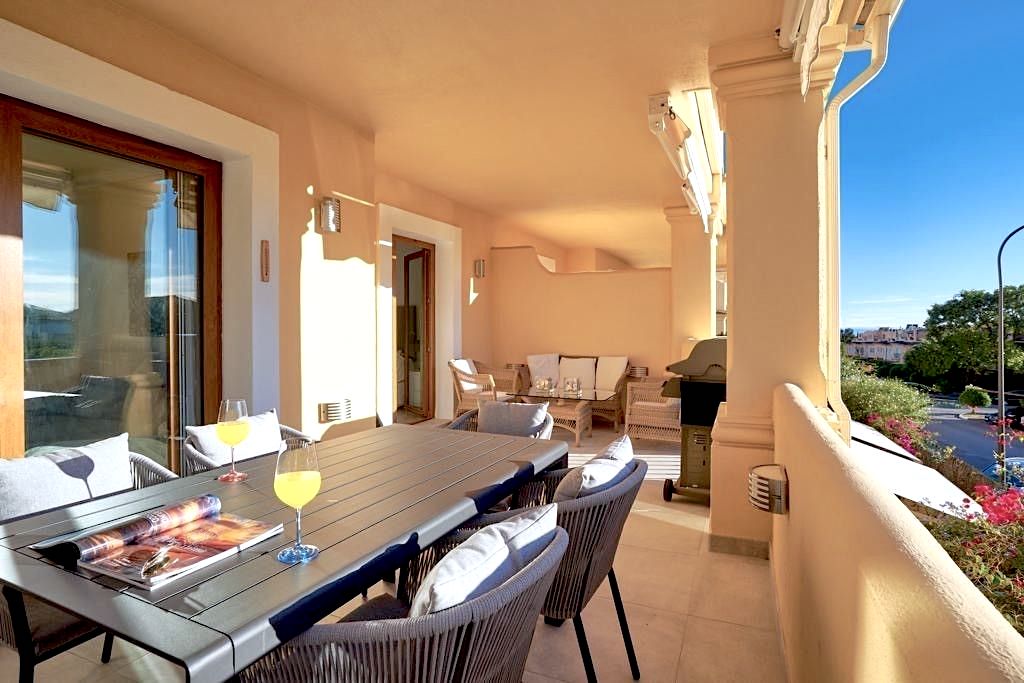 The apartment has a large terrace overlooking the sea. The terrace is tiled and contains a dining area and a seating area. Awnings. Very good sun conditions.