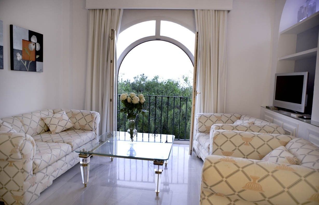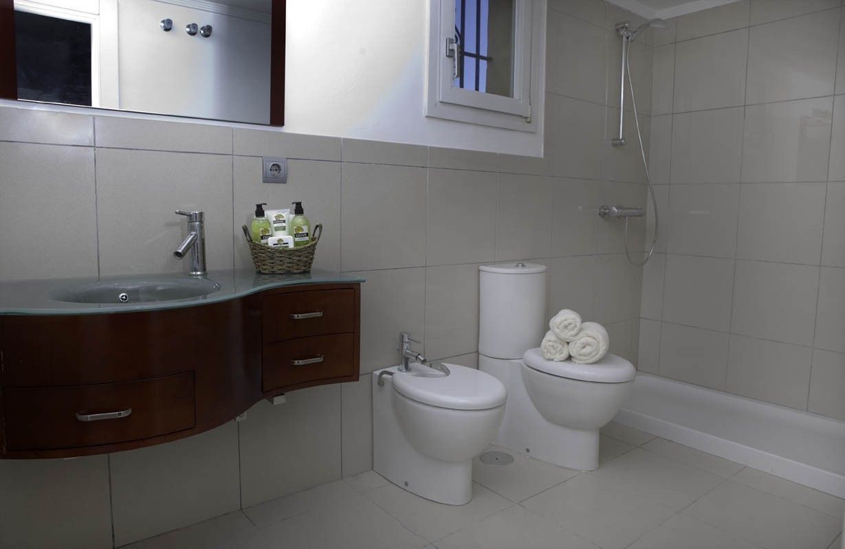 The main apartment is 160 sqm and contains three bedrooms with three bathrooms, a large living room with dining area, a well-equipped kitchen with washing machine and dishwasher, two large terraces and a small porch.