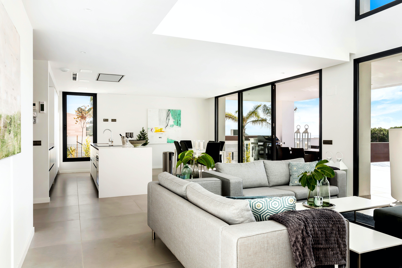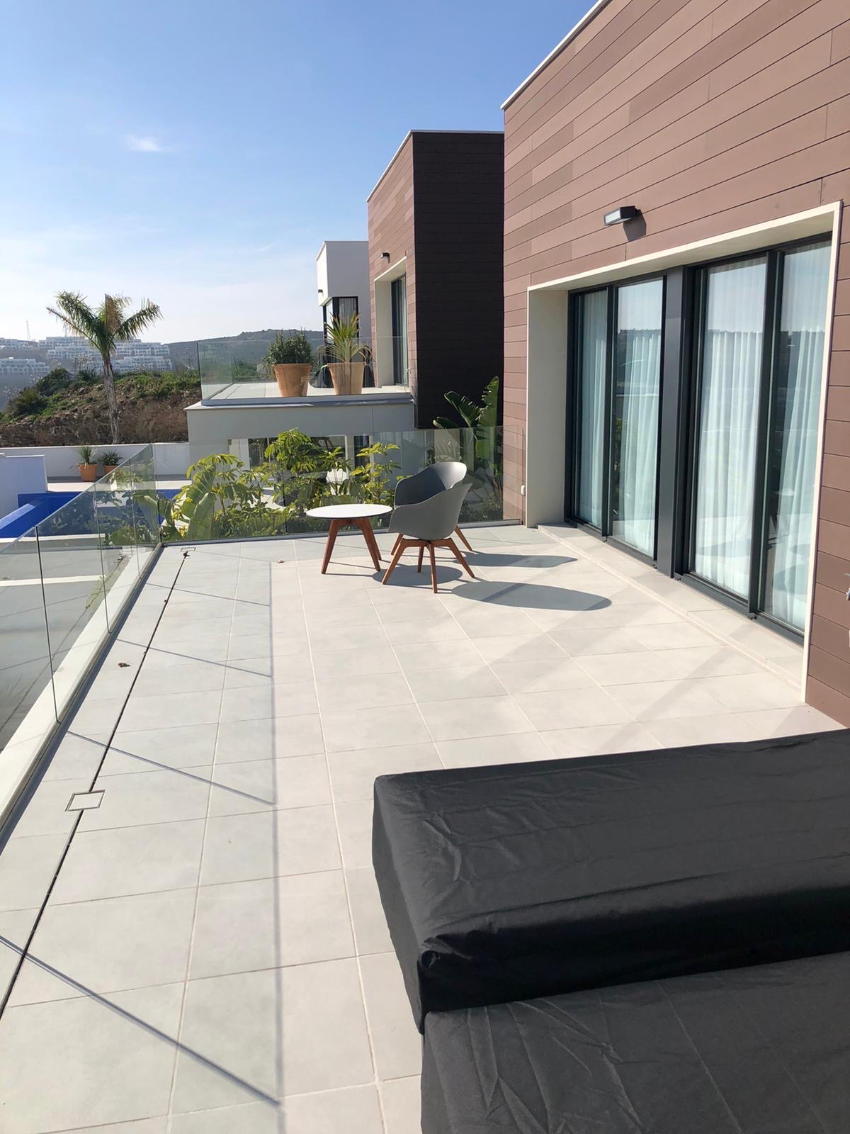 Property dimensions, it has 281 m² built, 190 m² interior and 91 m² terrace. Country view, garden view, mountain view, panoramic view, pool view, sea view, amenities near, close to children playground, close to schools, close to sea / beach, close to shops, close to town, transport near, air conditioning, ceiling heating system, solar panels, underfloor heating (throughout), brand new, alarm, automatic irrigation system, covered terrace, fitted wardrobes, glass doors, home automation system, private terrace, satellite tv, solarium, telephone, uncovered terrace, fully fitted kitchen, open plan kitchen, laundry room, storage room, double glazing, gated community, surveillance cameras.