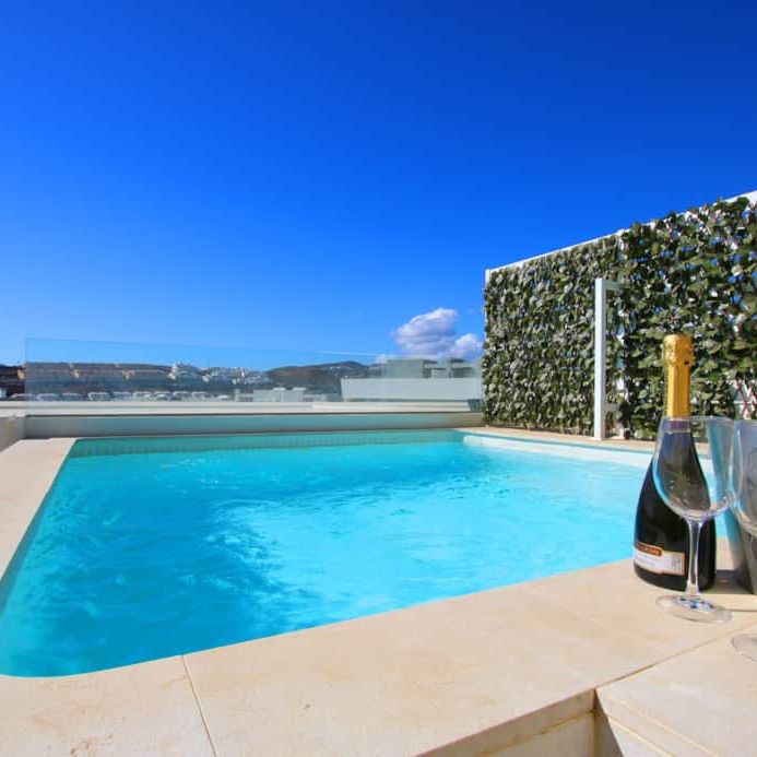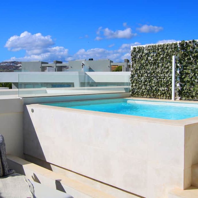 Lovely townhouse with 4 bedrooms and 3 bathrooms. The home was completed in the summer of 2020, and is of a very high standard. It is nicely decorated and very well equipped. Large roof terrace with a small private pool. Two parking spaces in the basement with direct access to the apartment. Lovely communal gardens with two communal pools with salt water and a children’s pool. Walking distance to the beach, supermarket, restaurants and the small town of La Cala de Mijas.